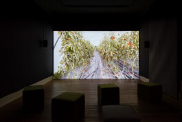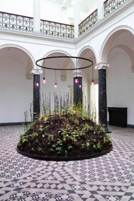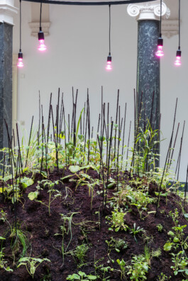 Erdenkugel, 2021, Metall, Stahl, Erde, Pflanzen, UV-Lampen, Höhe 100 cm, Durchmesser 333 cm, Courtesy of the artist und Villa Merkel, Galerie der Stadt Esslingen; Installationsansicht Api étoilé – Ein wachsendes Archiv, Villa Merkel Esslingen, DE; Foto: Frank Kleinbach