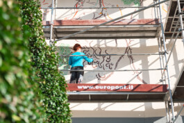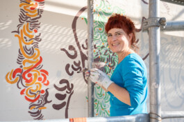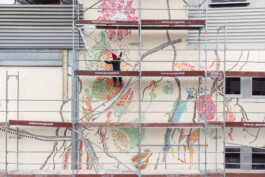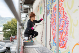 „Wenn ich mir das tägliche Treiben; das Kommen und Gehen von Menschen, das Arbeiten in den Büros, Aufenthaltsräumen, Schulungszentren, Labors und Werkstätten des Noi Techpark Bozen bildlich vorstelle, so ergibt sich für mich eine organische Netzstruktur. Ausgehend von dem Bild einer Lärche gibt die Wandzeichnung dieses zusammenhängende Gefüge wieder. Die Zeichnung gibt nicht den Baum Lärche als Abbild, als einen wiedererkennbaren Baum wieder, sondern vielmehr bezieht sie sich auf wissenschaftliche Pflanzendarstellungen und zeigt einen mikroskopischen Blick: Beginnend bei den Samen, Das Werden, Das Wachsen und Das Vergehen. Die Zeichnung Life Cycles bildet den Jahreskreis ab, das Keimen und Blühen im Frühjahr, die grünen Nadeln im Sommer, das Orange des Herbstes und den Stillstand im Winter. Die Wandgestaltung zeigt die Zusammenhänge im Wachsen einer Pflanze auf. Sie geht Kooperationen mit anderen Pflanzen ein. Sie ist eingebettet in eine Struktur des (Nahrungs)Austausches. Ganz im Sinne der Idee des Noi Techpark Bozen: ein organisches, verwobenes Gebilde, ein Stück Wald, ein zusammenhängendes funktionierendes (Öko)System.“
