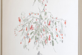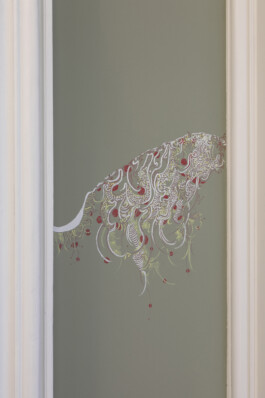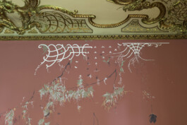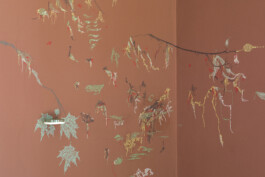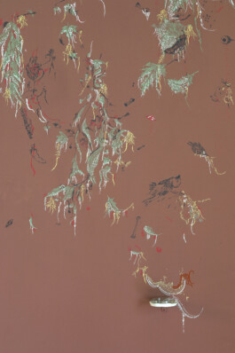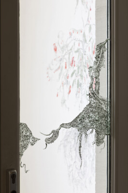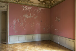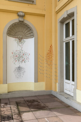 Over a period of three years, Gabriela Oberkofler, a member of the Morsbroich workshop, developed a permanent, expansive mural: starting from the Rococo stucco ceiling of the former ladies’ salon, her work gradually overgrows the wall, bringing plants, animals, and humans into relation with one another. Outside, on the back of the same wall, a delicate web of lines spreads out in a niche, reaching down to the roots. Finally, the two parts, inside and outside, the world above and below the earth, are connected by ornamental tendrils and a curtain of flowers and water droplets—the elixir without which coexistence on earth would not be possible.