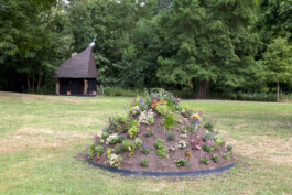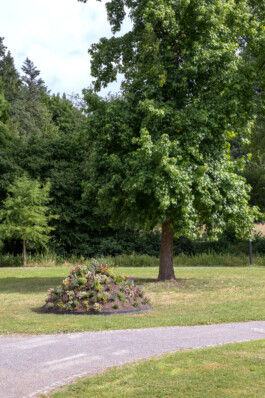 In the summer of 2025, Gabriela Oberkofler’s Erdenkugel (Earth Globe) was installed in the sculpture park of Museum Morsbroich with the support of volunteers. To the left behind the main building, her work has been created using living plants, a kind of slow gardening art project. A mound of earth rises up on the lawn, on which the artist has planted a sustainably growing mixed bed – a colorful mixture of edible wild herbs, which Gabriela has been collecting in a large seed archive since 2017.