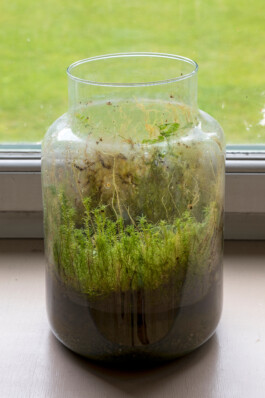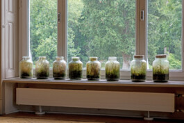Gabriela Oberkofler captured the dynamics of the early phase of the workshop process with her moss work. She invited the artists of the workshop to bring moss from their hometowns or elsewhere. Gabriela placed two or three different types of moss in a jar, which has remained sealed ever since (!). Each jar functions as a self-contained ecosystem in which the moss absorbs water in a cycle, extracts nutrients from it, and releases the liquid again. The mosses grow in the jars, they mate and crossbreed. As in an experiment, new, previously unknown species emerge.