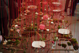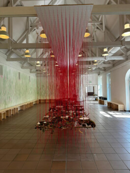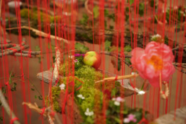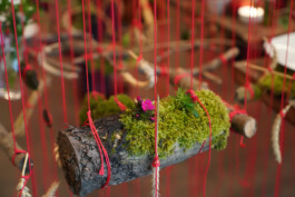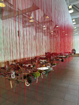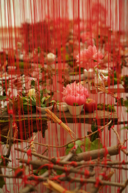 She hung hundreds of red strings from the ceiling and designed the garden hall like a spatial drawing, with densely placed vertical hatching in the center of the room and largely abstract painting on the back walls, which could be read as a landscape with its green and pink tones, a counterpart to the window views of the castle garden opposite. What came together at table height to form a multi-part, visually overwhelming yet fragile table that swayed delicately when handled were all small wonders of nature: moss-covered branches, (serving) boards made of old wood, leaf tendrils, flowers, ears of corn, and fruits. However, the fact that this brilliant image of nature, in all its lightness and opulence, literally hung by a thread also made it a metaphor for vulnerability. As the food was served course by course, it gave the impression that nature itself was offering the feast—a gift that one was invited to accept with a different awareness.