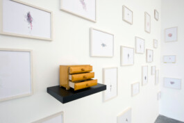 Die in einer Schatulle aufbewahrten Insekten wie Libellen, Käfer, Hummeln, Bienen … finden sich in den kleinformatigen Zeichnungen wieder und zeigen in einem fragilen Zusammenspiel wiederum den Zerfall (es fällt, Installation mit einer Schatulle und darin aufbewahrten Insekten, 35 Zeichnungen unterschiedlicher Grösse, Filzstift und Tusche auf Papier, 2012).